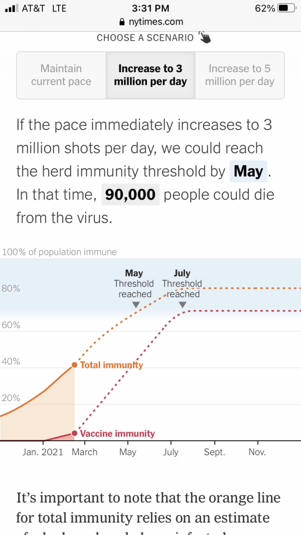 At the time, about 1.7 million Americans a day were being vaccinated. The Times suggested if the United States raised that number to 3 million, it would reach herd immunity in May, when roughly 40 percent of the population was fully vaccinated and 30 percent more had immunity from a previous infection.