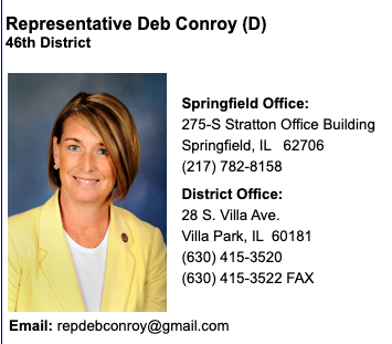 Here’s a link on how to contact Rep. Deb Conroy. She’s a member of the Illinois House Democratic Women’s Caucus and — no surprise — was also a District 205 School Board member. If you contact her, be polite. Don’t fall into the trap of becoming what she is.