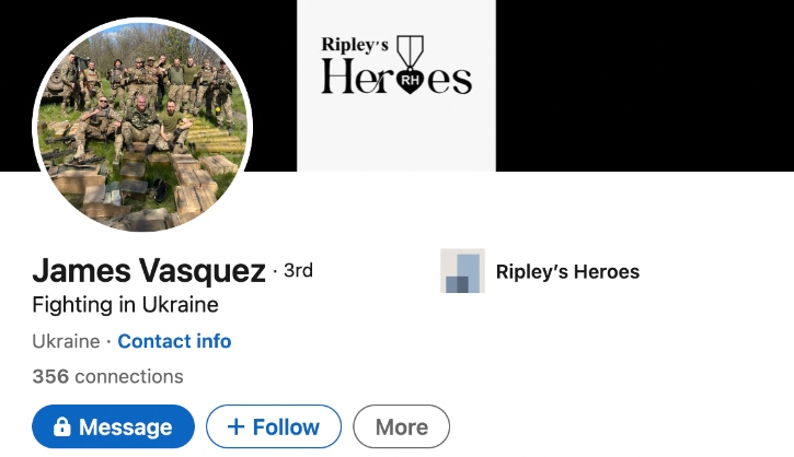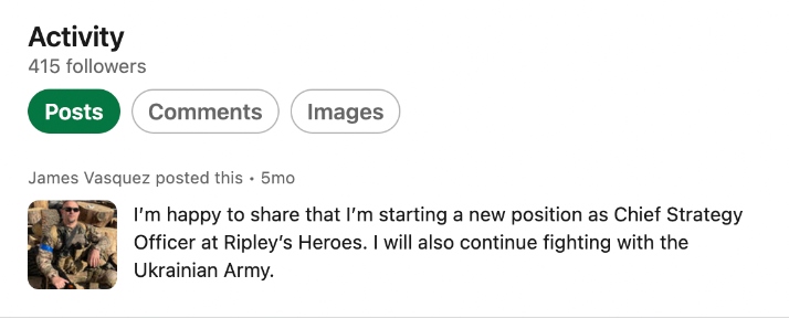 Vasquez’s LinkedIn says he’s with Ripley’s Heroes and that he is the company’s “Chief Strategy Officer,” as well as listing him as “fighting in Ukraine.”