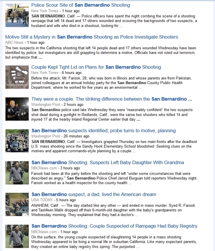 The following is a screenshot of a Google News search with the key words “San Bernardino shooting:”