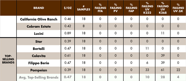 Our testing indicated that the samples failed extra virgin olive oil standards for reasons that include one or more of the following: (a) oxidation by exposure to elevated temperatures, light, and/or aging; (b) adulteration with cheaper refined olive oil; and (c) poor quality oil made from damaged and overripe olives, processing flaws, and/or improper oil storage.