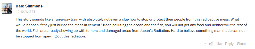 Regarding this forever-lied-about Fukushima tonnage released daily, the problem is two-fold— 1) only a small (yet growing) number of dumbed-down, Facebook and Twitter-absorbed, McDonald’s food-engorging people are even AWARE…..yes, after five years…..of how serious Fukushima is. It is because the mainstream media doesn’t breathe a word about it. 2) the second issue is RAMPANT APATHY, RESIGNATION, AND DENIAL. I sent the bleak and depressing coast-of-Chile sardine kill photos to friends everywhere and not even ONE (we are talking about people your age and mine….about 65….highly successful and intelligent) wrote me back with perhaps a query as to whether it MUST BE radiation from Fukushima or if it MIGHT HOPEFULLY BE El Nino algae “red bloom” choking off oxygen.
