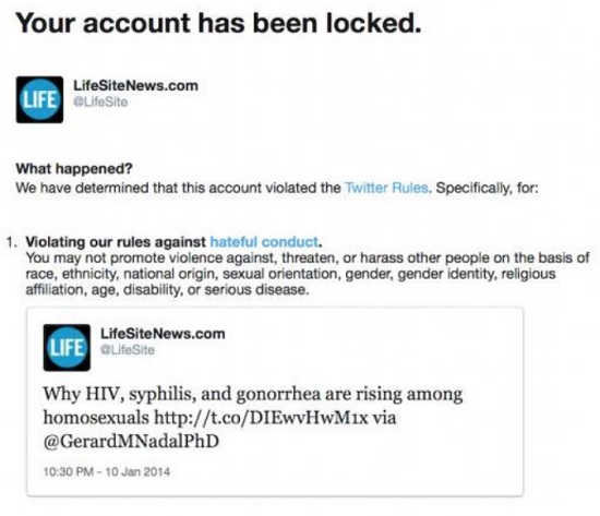 On October 18, 2018, however, LifeSiteNews received the following message, notifying staff that Twitter was locking the account because the 2014 tweet sharing the story’s neutral, factual headline violated “our rules against hateful conduct,” and somehow “promote[d] violence against, threaten[ed], or harass[ed] other people on the basis of […] sexual orientation […], or serious disease.”