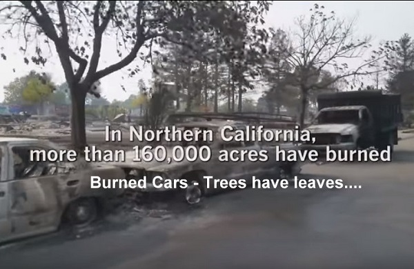 CrazzFiles.com has also posted a collection of photos from the California fires that seem to show anomalous behavior. See some of those photos are posted here, including this first one that shows cars and trucks burned out, but nearby trees appear to still retain their leaves: