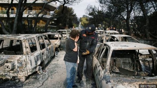 According to internet analysts, these Direct Energy Weapons are being used around the world to torch intended targets while being able to blame them on natural fires. The following photo was supposedly taken in Greece, and it appears to show an entire street of burned and melted automobiles, surrounded by trees on both sides of the road which were miraculously undamaged (and still have their leaves):