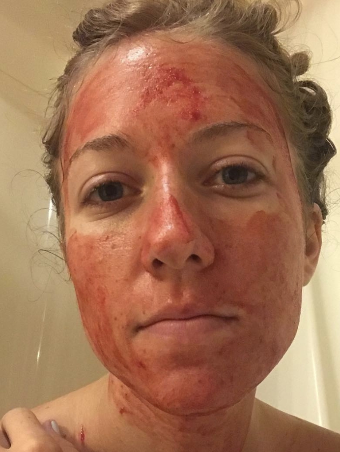 One of the photos she posted has the word “Shameless” written in blood on one of her legs. And, as shown above, others show blood smeared on her face.