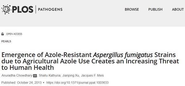 In 2013, a published science paper examined the spread of azole-resistant Aspergillus fumigatus arising from the agricultural use of azole fungicides. The paper was published in PLOS Pathogens with the title, “Emergence of Azole-Resistant Aspergillus fumigatus Strains due to Agricultural Azole Use Creates an Increasing Threat to Human Health.”
