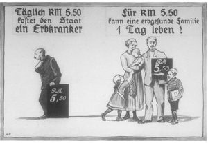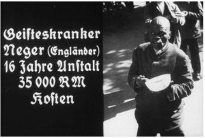 And now here are some posters that Hitler had his PR campaign published to convince the Germans and the world that there was a “master race” of people who needed and deserved to live (blond hair, blue eyes, German, smart, physically fit, etc.), but everyone else was a burden on society and needs to be exterminated. The posters point the finger at people of color, of mental handicaps, of autism, of senior age level. Do you see the connection?