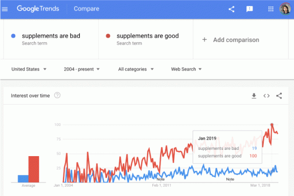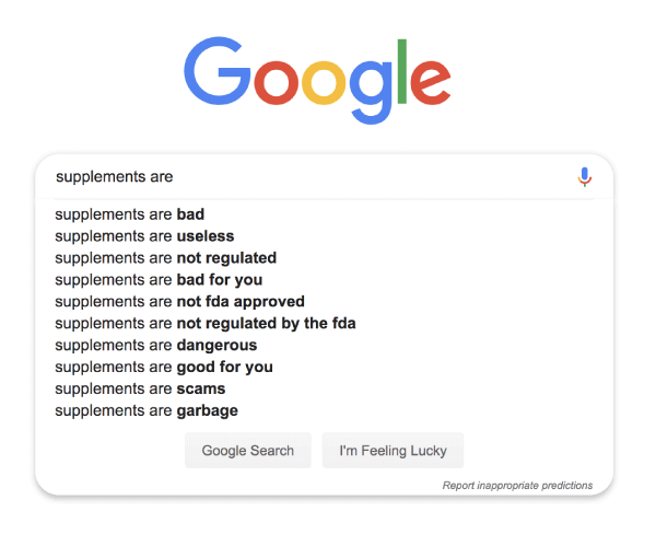 That’s right, in the entire population of the United States (327,321,076 as of March, 26, 2018), at most 2.7 people type the phrase “supplements are bad” into the Google search engine. But if any of those 327 million people type “supplements are…” into the Google search engine, all 327 million users will have their search completed for them with the suggestion that they are “bad” and search for information on how bad they are.