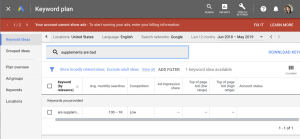 Amazing, a third Google product from its extremely profitable Google Ads division called Keyword Planner, shows an even more accurate quantification of how many searches have actually been performed in the United States in the past month with the phrase: “supplements are bad.” The result? Only 100-1,000 searches, which is between only .2739 and 2.7 people a day.