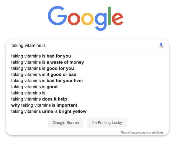 In order to demonstrate that this result is not a fluke, let’s look at the search “taking vitamins…” and see what Google suggests in their autocomplete.