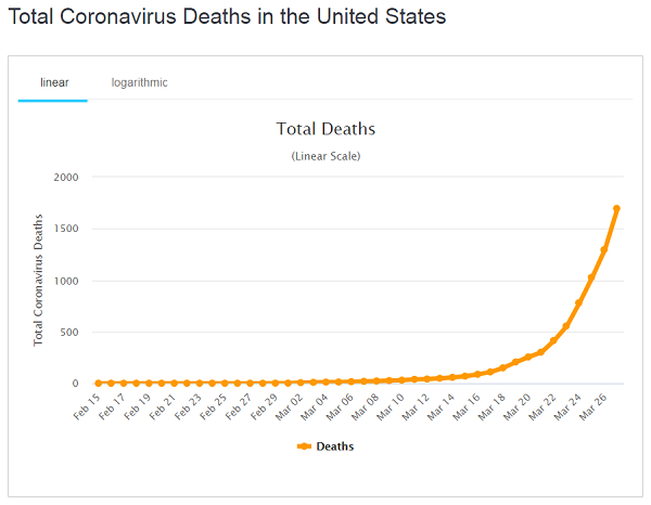 And here’s what the aggregate (total) deaths now looks like in America, as we approach 2,000 confirmed fatalities from coronavirus: