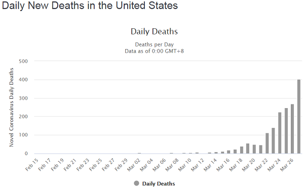 The United States now stands at 112,560 confirmed infections and 1,878 deaths as of this writing. Yesterday alone, 406 people died from the coronavirus, and that daily fatalities number will continue to grow for some time yet to come, perhaps reaching 1,000 per day.