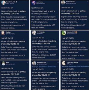 One particular message that is making rounds is the lie that ERs and ICUs are getting swamped by unvaccinated people. This message was disseminated across Twitter and made to look like it is coming from a concerned healthcare worker: “I just left the ER. We are officially back to getting rushed by COVID-19. Delta Variant is running rampant and it’s MUCH more transmissible than the original virus. 99% of our ICU admits did NOT receive a vaccine.” This message was NOT sent out by a real healthcare professional working on the front lines. This message is being sent out VERBATIM across several social media accounts, using fake bots. These messages are being used to psychologically subvert the masses and achieve greater levels of compliance.