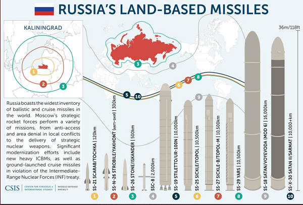 Familiarize yourself with the following chart showing Russia’s missile capabilities. The chart is sourced from the Center for Strategic International Studies: