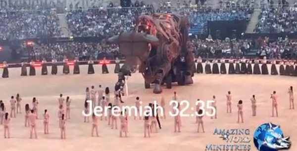 The iconic image from the luciferian ritual opening is shown below, notice the use of fire and smoke to indicate a “world on fire” while Satan’s Baal demon creature is now glowing with light, center stage, indicating that Satan rules over Earth and commands the nations of the world into war: