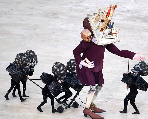 Here’s a partial image from TheGuardian.com, photograph by Neil Hall, which shows the depiction of the two-headed Church beast, animated by small skeleton creatures dressed in darkness and death. This image shows how various renditions of the Church (i.e. the Vatican and the Pope) are actually puppets of the luciferian death cult, literally being “propped up” by the undead: