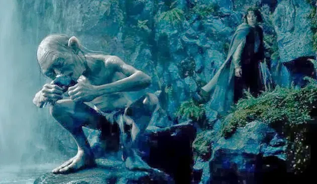 The scene is almost perfectly ripped from Lord of the Rings, where Smiegel (Gollum) is beating a fish to eat it raw: