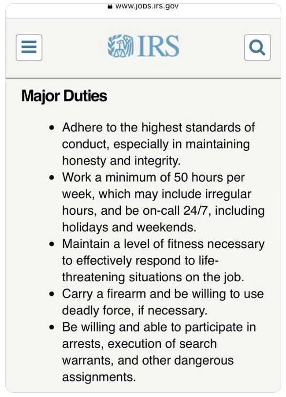 The IRS, for example, is running help wanted ads for tax enforcement agents who are “willing to use deadly force” against the American people. This is openly touted by the IRS in multiple job openings that also declare applicants must be willing to “participate in arrests, execution of search warrants, and other dangerous assignments.”